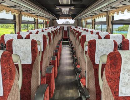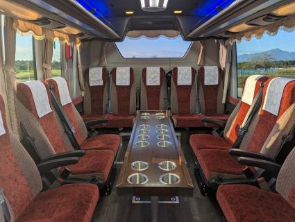 後部席はサロンセットも可能。テーブルを囲んで向き合えば、会話も弾みます。