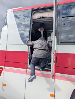 乗務員はバスの中で昼食のお弁当を戴きました。